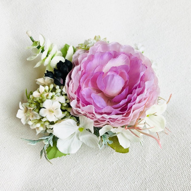カラフルな花達をブーケの様に詰め込んだような小ぶりサイズの花のコサージュです。 サーモンピンクのバラにとわすれな草に 褐色のリーフや実、多肉系などを細かく配置しています。 角度を変えると表情が変わる庭をイメージした品です。 ヘッドアクセサリーに、 またバッグ、帽子などに合わせてお使いいただけます。 ▼素材 アーティフィシャルフラワー 安全ピンとグリップ部分:メタル 【サイズ】 幅:10㎝ シダの葉が横に長めに出るようにお作りしたため幅があります。 縦:7㎝ 横:5㎝ 【花材】 ラナンキュラス、ベリー、マム、多肉系